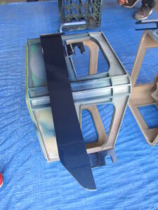 爪(持ち上げる二本の棒の部分)がアタッチメントで長くなってます。もともとのオレンジ色の上からブルーの塗装をしてあるのですが、この青色塗料が曲者でして・・・。元の車体色に塗られた青色の状態でメタリックを塗装すると青色が溶けて大変なことになります。
