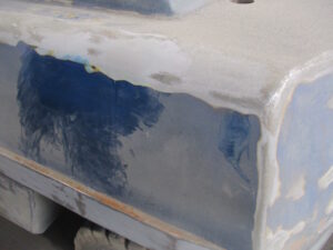 なんと青い塗装面を剥離していくのです!相当大変ですが電動工具などを使って手作業で取っていきます。これが今回の中でも最大限に大変な作業になりました。