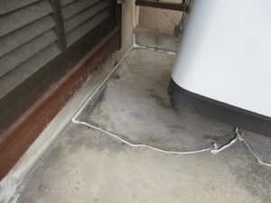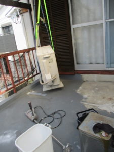 こんな感じのベランダで・・・。クーラーの室外機を吊っております。防水は金魚鉢みたいにすべてを覆わねばなりません。