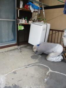 本人が写っております。洗濯機を吊って漏れていそうなひび割れなどを埋めます。
