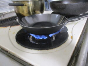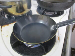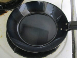 このように買ってきたら使う前に空焼きをします。表面に一次防錆、いわゆる陳列中は空気に触れて製品が錆びないようにクリヤーが塗装されているのです!空焼きしてしばらくすると煙が出てきますが塗料を焼いているのですね!がんがんやいて艶が消えたら洗って又軽く温めサラダ油を入れて馴染ましたら最初の儀式は終わります。次からは普通に使えばいいのです!