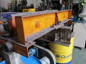 モーターも掃除して動作確認して消耗品を交換、オレンジで綺麗に塗り分けしました!!大変きれいになり見違えました!!元々レール部分は激しく丈夫なH鋼だし。機械よりも単純な機構といえばそうかも・・・。