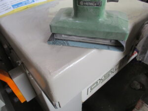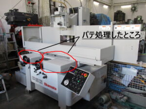 今回は【岡本工作機械 平面研削盤】(機械に疎いのでネット検索しましたが金属を平坦に削るのが役割だと思われます)の作業台が深く削れている状態で塗装だけでもいいのですが、折角なのでパテ処理をして新品とまではいきませんがお客さんに喜んで頂けるよう励んでおられました。