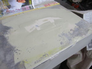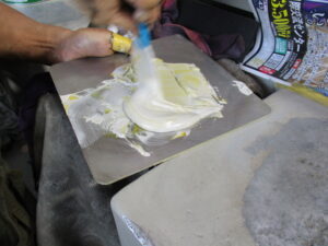 厚付け(種類は色々ありますが)パテは2液タイプです。主剤と硬化剤と盤上でしっかり練って練って・・・・