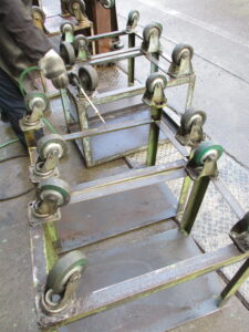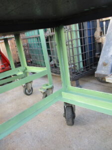 コチラの台車は普通の市販品のような華奢なつくりではなく、ゴリゴリの製造業のプロが重宝するほどの堅牢なつくりです!油汚れ状態の製品写真は撮れませんでしたが、作業に没頭されている〇山さんは『相当油でコテコテやったよ!』との事でした。油は勿論サラダ油なんかのサラサラでは無く、こってりした機械油にゴミ等が絡まった逸品だったそうです。