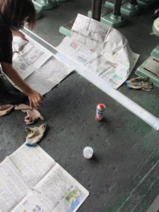 新聞とマスキングテープを使い養生していきます!もうこれがきれいに仕上げる肝でございます。『おりゃー』と気合を入れてます!